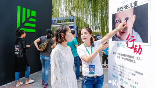 2017年9月16日,36氪首届互联网粉丝节在北京石景山游乐园开幕,近千平米的红杉“人生创业馆”吸引了数千名游客参与挑战。作为红杉被投企业代表,盛诺一家在人生创业馆中发起“关注RB(视网膜母细胞瘤)儿童”的爱心行动,并在现场收集祝福卡,全场总计有逾千名粉丝签名祝福并贴上了爱心墙,这些祝福卡在2017年的圣诞夜送到了正在美国治疗RB患儿的手中。