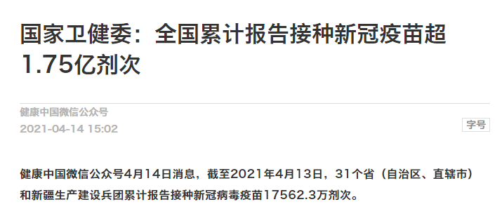 至于我国,同样走在疫苗接种的前列。国家卫健委发布消息显示,截至4月13日,全国累计报告接种疫苗已超1.75亿剂次。
