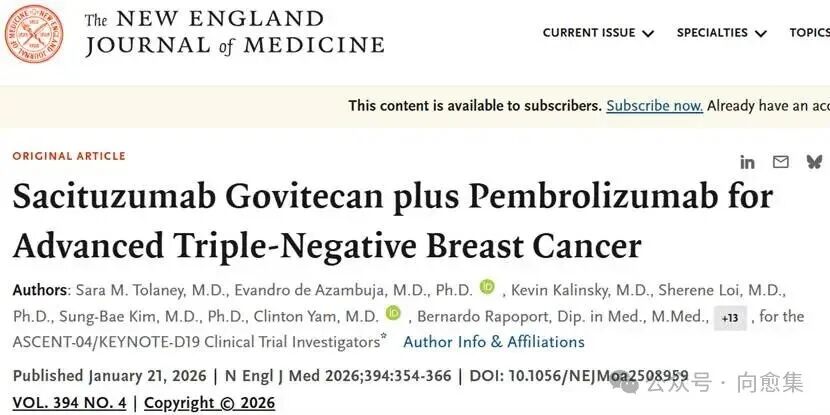 如今,这一困境有望迎来改观。1月21日,顶级医学期刊《新英格兰医学杂志》(NEJM)发表了一项代号为ASCENT-04/KEYNOTE-D19的三期临床研究结果:由ADC药物(戈沙妥珠单抗)与免疫药物(帕博利珠单抗)组成的“黄金搭档”,刷新了转移性三阴性乳腺癌的生存纪录!