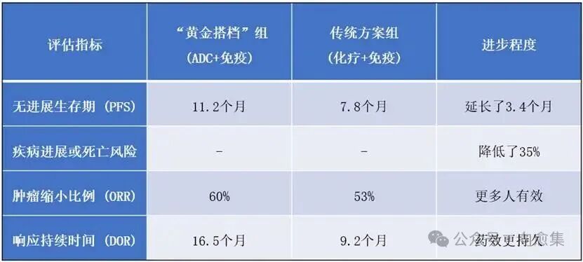 无论是无进展生存期,还是肿瘤缩小比例、响应持续时间,ADC+免疫的“黄金搭档”组合都明显优于化疗+免疫的“传统疗法”,整体上多降低了患者35%的疾病进展或死亡风险。