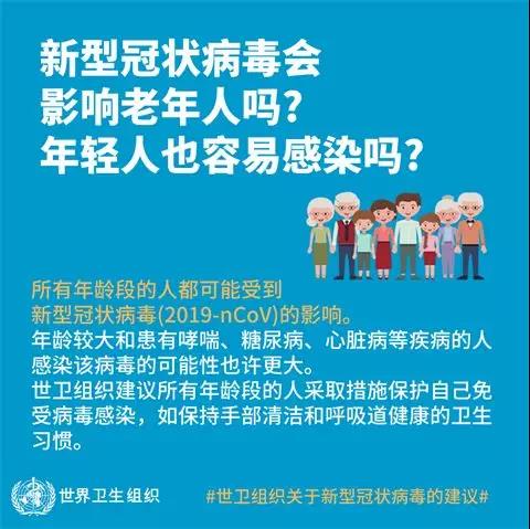 所有年龄段的人都可能受到新型冠状病毒(2019-nCoV)的影响。年龄较大和患有哮喘、糖尿病、心脏病等疾病的人感染该病毒的可能性也许更大。