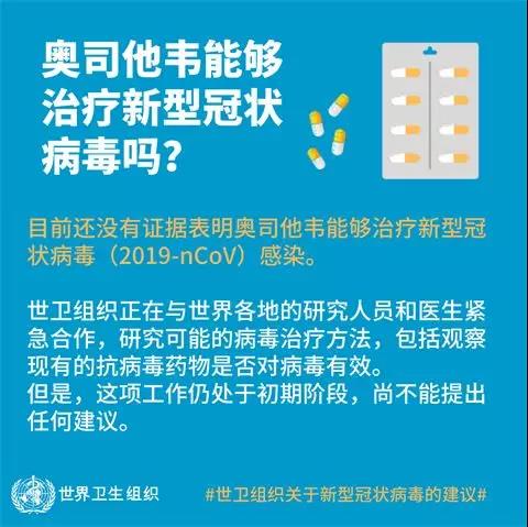 目前还没有证据表明奥司他韦能够治疗新型冠状病毒(2019-nCoV)感染。世卫组织正在与世界各地的研究人员和医生紧急合作,研究可能的病毒治疗方法,包括观察现有的抗病毒药物是否对病毒有效。但是,这项工作仍处于初期阶段,尚不能提出任何建议。