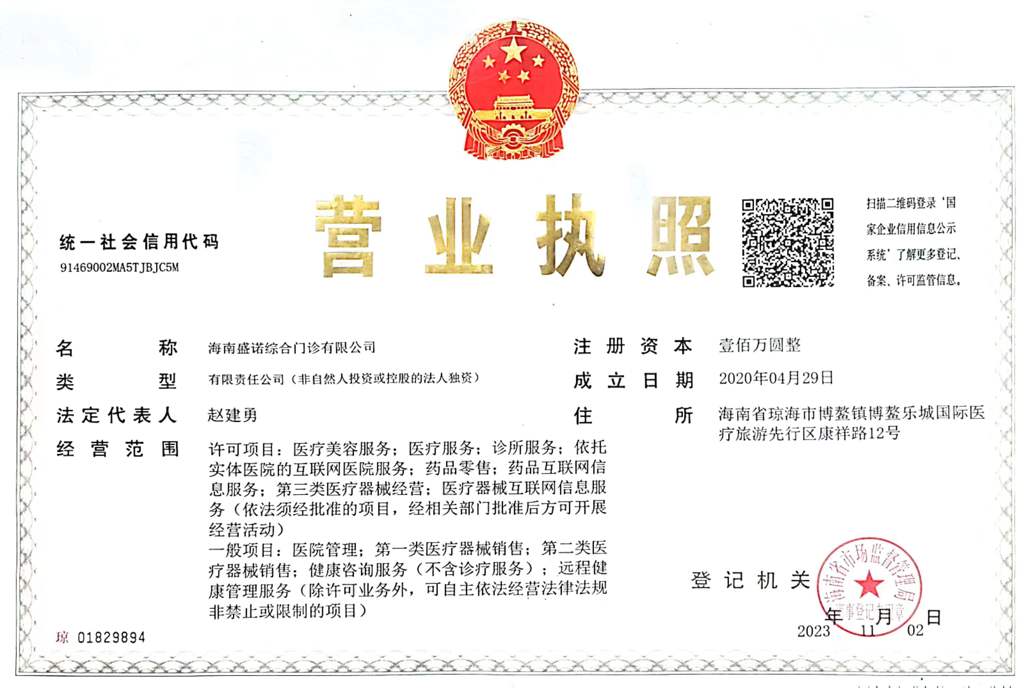 2020年12月,在海南省国际经济发展局、省卫生健康委员会、省药品监督管理局及博鳌乐城国际医疗旅游先行区管理局等相关部门的大力支持下,海南盛诺综合门诊正式落地博鳌,并获得国家医疗机构执业许可证。