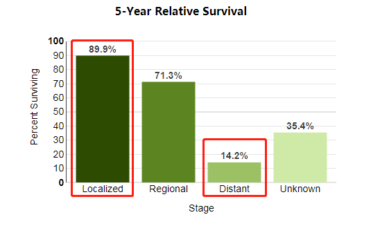 下面是一组美国国家癌症研究所官网的癌症5年生存率数据,我们可以从中看到,癌症的早期与晚期,预后差距有多么悬殊。