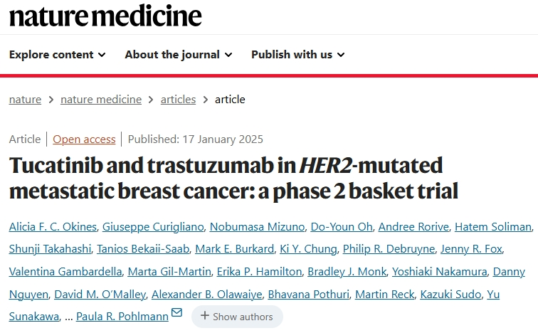 近日,发表在知名国际医学期刊《Nature Medicine》上的一篇研究论文,公布了一项2期临床试验的积极结果。该试验主要评估了HER2靶向药Tucatinib(图卡替尼)与Trastuzumab(曲妥珠单抗)联合使用,对HER2突变型转移性乳腺癌的疗效和安全性。研究结果表明,该联合疗法取得了非常积极的疗效,并且具有良好的安全性。