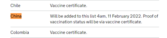 英国政府承认的疫苗范围包括中国的科兴和北京生物,并且自2022年2月11日凌晨4点起,中国将被列入英国政府“承认的疫苗接种证明发行国家和地区”名单(Countries and territories with an approved proof of vaccination)。